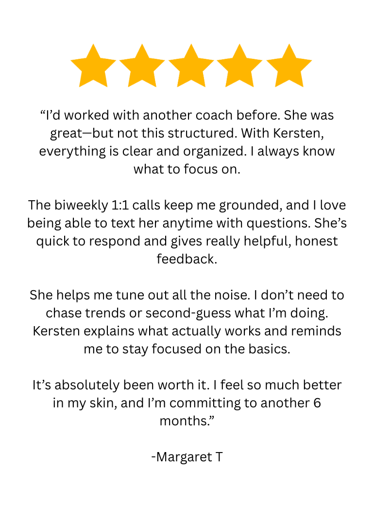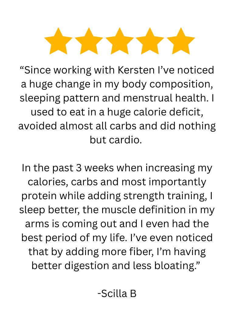 A 6 month custom built nutrition plan, biweekly phone calls with Kersten, and adjustments to your plan as needed as progress happens and goals change.